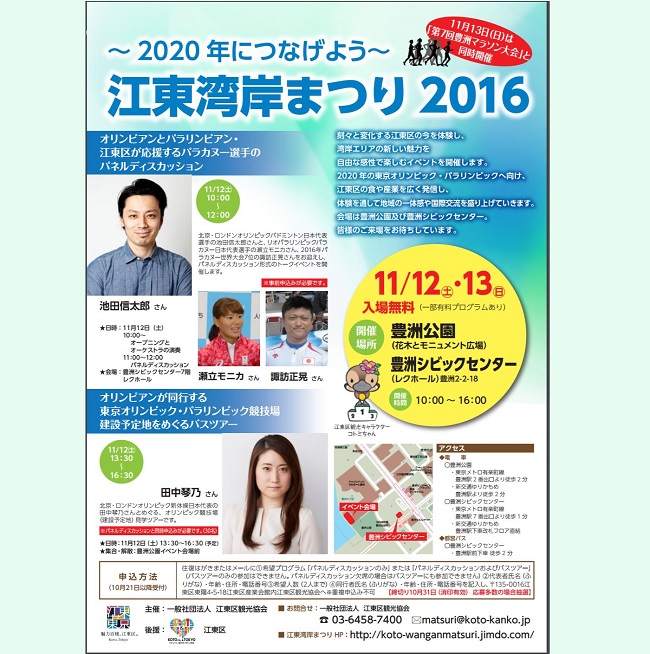 11月12日(土)・13日(日)、2020年につなげよう!江東湾岸まつり2016が開催されます!楽しいイベントやパフォーマンスがいっぱいです!13日は、豊洲マラソン大会も行われます!みんなで豊洲へお出かけくださいね♪