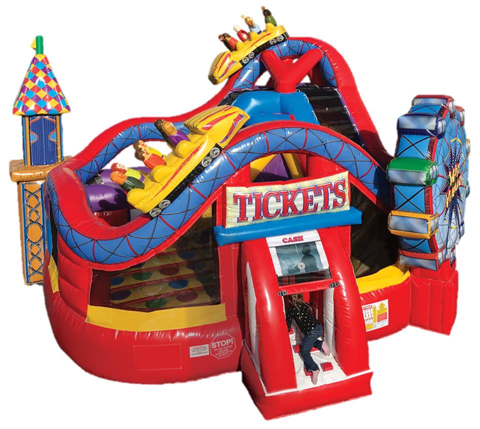 観覧車やジェットコースターが目印!遊園地型エアー遊具の中で飛んだり跳ねたりして遊ぼう!