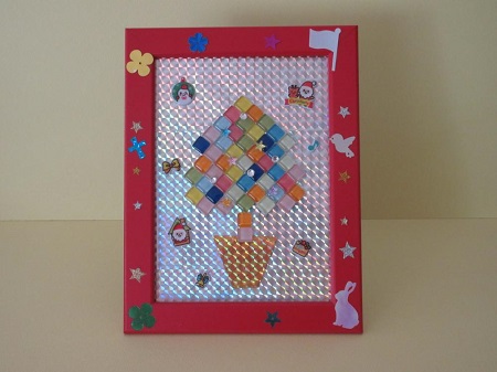 角度によってキラキラと光るホログラムのベースの上に、色とりどりのタイルをはり付けてツリーを作ります。