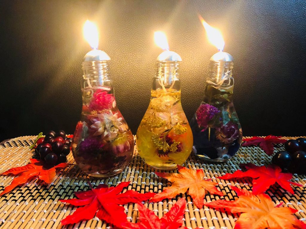 昼は植物の美しさを楽しむハーバリウム、夜はランプとして炎のゆらぎに癒される素敵なインテリアをお作りいただきます。