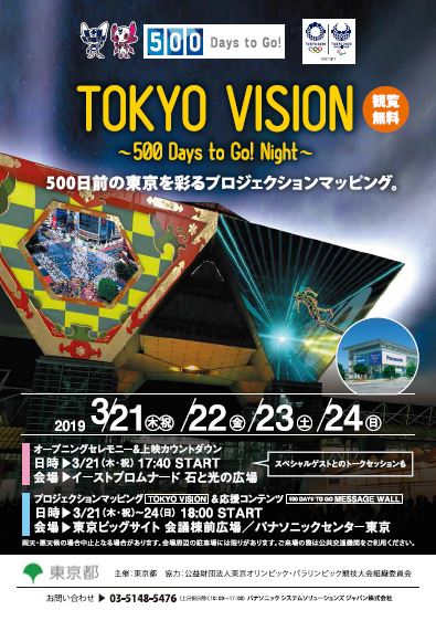 東京ビックサイトおよび、パナソニックセンター東京で3月21日(木・祝)から24日(日)の期間、500 Days to Go!「TOKYO VISION~500 Days to Go!Night~」が開催されます。