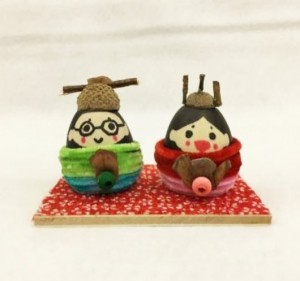 「おだいりさま」と「おひなさま」が並んでいるだけで、かわいい♪ この季節になると、おひなさまをおりがみなどでも作りますが、今回はちょっと変わった、木の実が土台のおひなさまです!