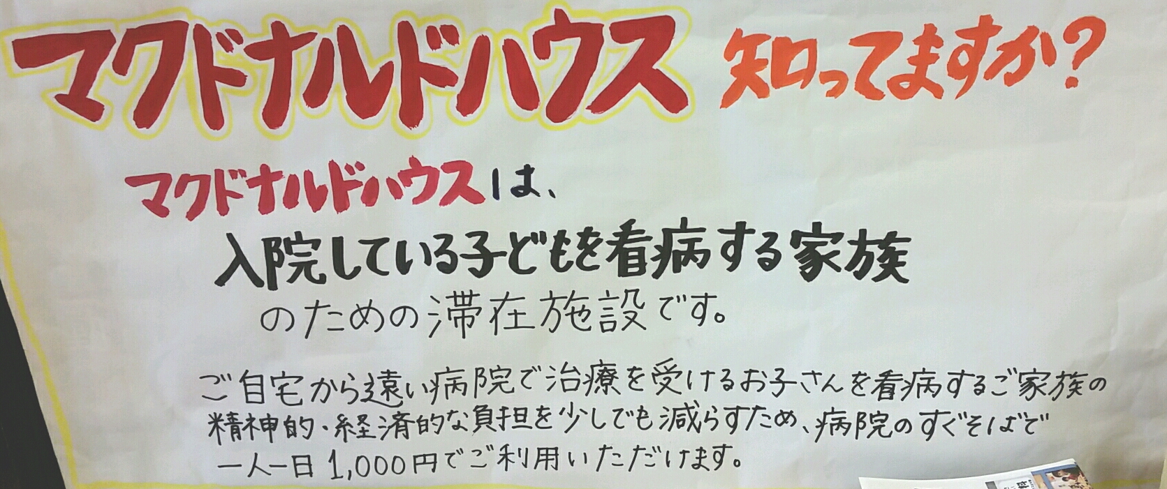 マクドナルドは、色々なご心配をお掛けしましたが、信頼を取り戻すべく、頑張っていますので、是非足を運んでください。『ドナルドマクドナルドハウス』の、普及活動をしています。興味をもっていただけたら嬉しいです。