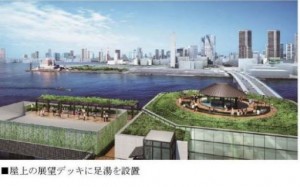 豊洲の立地特性を活かし、24時間営業の温泉・ホテルを展開します♪ 施設屋上の展望デッキには足湯を設置したり、キッチンスタジオや道具市を配置して、食の情報を発信します!