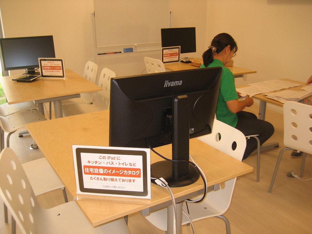 まちなみ公園のワンストップハウジンングスペースにはPC端末が用意されていて、住宅設備メーカーの電子カタログなど、家づくりに役立つ情報をワンタッチで検索できるシステムを揃えています。