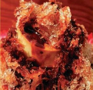 チョコレートシロップがたっぷりかかったかき氷に、カスタードプリンをトッピング♪