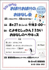 絵本や、パネルシアター、手遊びなど午前中より 少し大きい子向けのイベントです。ボランティアさんによる、ちょっとこわいおはなしが・・・。「亡霊井戸」って・・・。キャ~~~!!あとは来てからのお楽しみ~♪