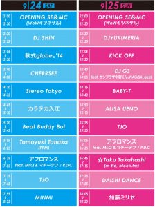 MINMI / Tomoyuki Tanaka (FPM) / TJO / 軟式globe。’14 / カラテカ入江 / Beat Buddy Boi / Stereo Tokyo / DJ SHIN / CHERRSEE / アフロマンス / Mr.Q (ラッパ我リヤ) / マチーデフ / P.D.C / MC WoW キツネザル
