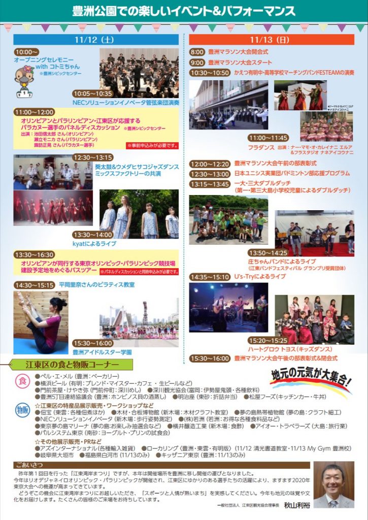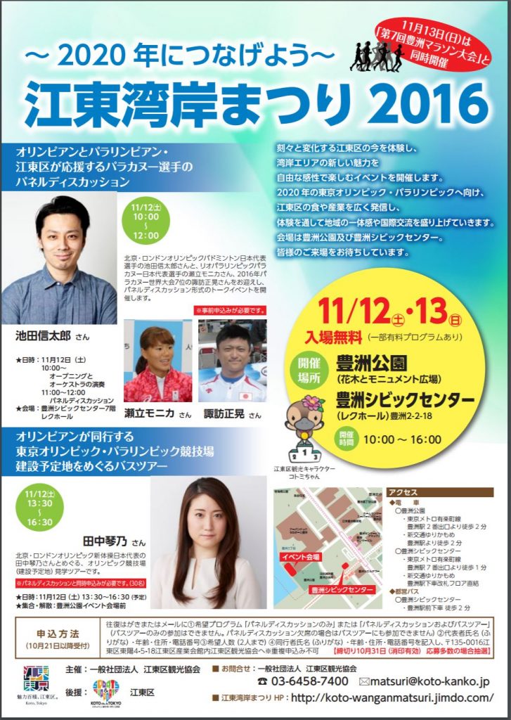 11月12日(土)・13日(日)、2020年につなげよう!江東湾岸まつり2016が開催されます!楽しいイベントやパフォーマンスがいっぱいです!13日は、豊洲マラソン大会も行われます!みんなで豊洲へお出かけくださいね♪