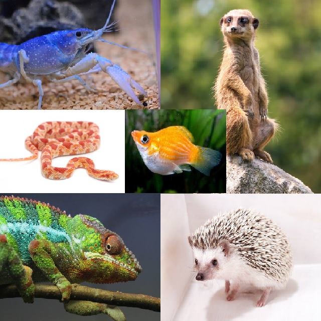 カメレオン、ヒョウモンリクガメ、フトアゴヒゲトカゲ、コーンスネーク、熱帯魚