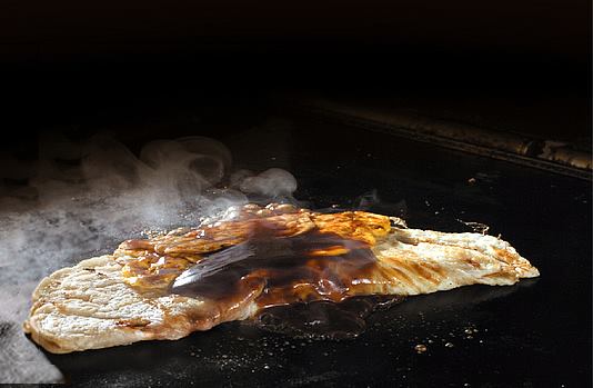 もちっとした食感の生地にイカの切り身がたっぷり!鉄板であつあつに、甘辛いソースをつけて