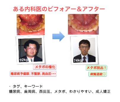 糖尿病専門の内科医・西田 亙先生は、7年前までひどい歯周病男で、92㎏を超える巨漢でもありました。ところが歯医者さんに通うようになったことがきっかけで、18㎏の減量に成功し、病魔は全て退散したのです!本日は「なぜ歯医者さんに定期通院することが大切なのか、そして必要なのか」、内科医の立場から体験談を踏まえながら、分かりやすくご紹介させて頂きます。