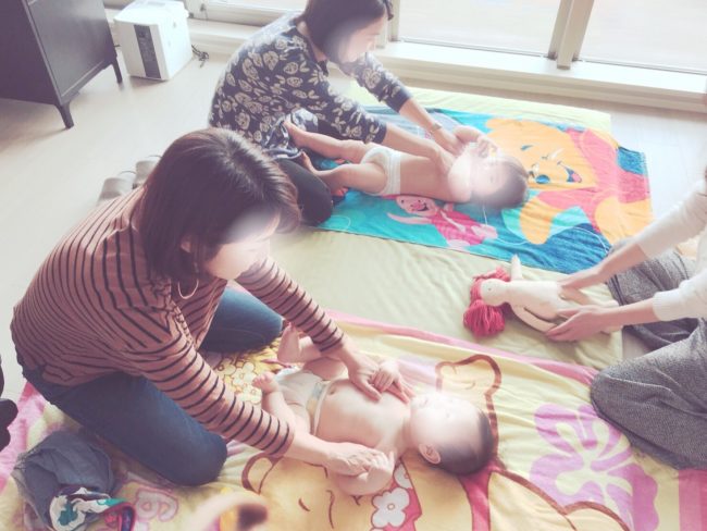 肌と肌が触れ合うこともとても大切なことです。豊洲では、毎月16日、元々ママ友だった伊藤三希子さんと一緒に『体験講座』を開催しています。