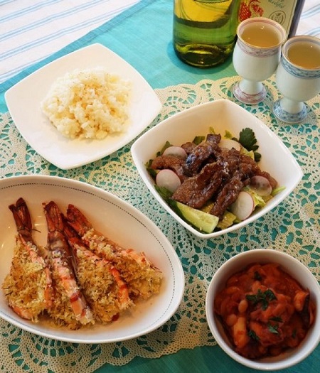 春菊と牛カルビのサラダ、タコと白インゲン豆のトマト煮込み、などなど・・・