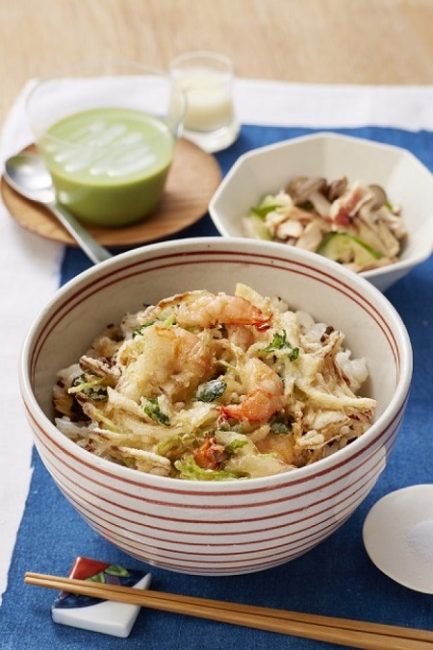 美味しく出来上がったかき揚げは、炊き立てご飯と一緒にお召し上がりいただきます。