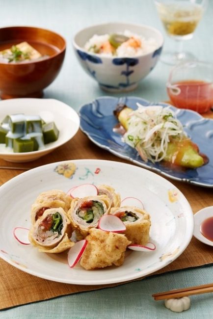 夏の青梅をふんだんに使った「梅シロップ」をはじめ、豚肉に梅肉、薬味野菜を巻いた「豚肉の胡麻風味巻き揚げ」