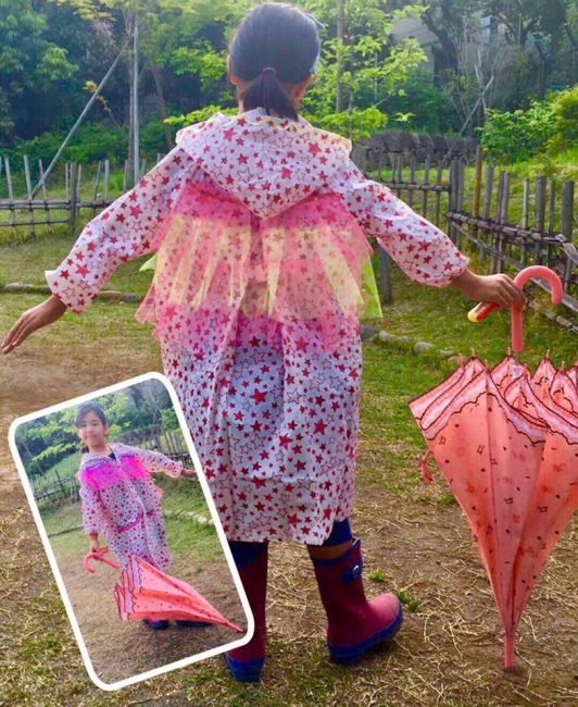ワークショップで作った雨の日グッズを身に着けて、特設パネルの前で記念撮影会を行います。
