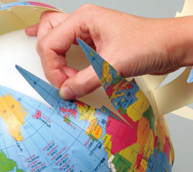 白い球状の土台に世界地図のシールを上手に貼って、地球儀を完成させよう!