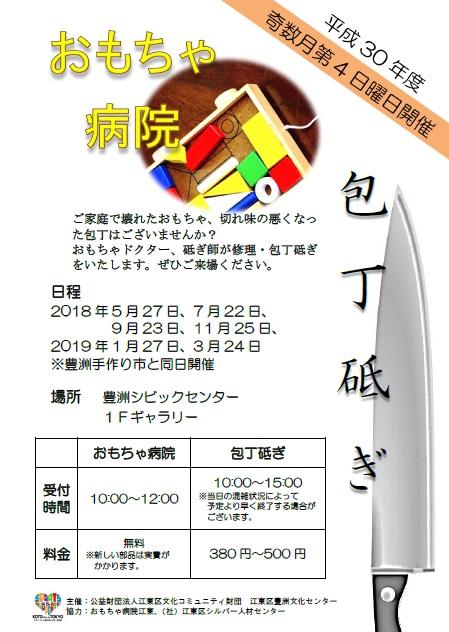 豊洲文化センターは、9月23日(日)、平成30年度豊洲文化センターのギャラリー活性化事業の一環で手作りの作品に出会える豊洲手作り市のほか、手作り体験教室や包丁砥ぎ体験、そして壊れてしまったおもちゃを修理するおもちゃ病院を開催します。