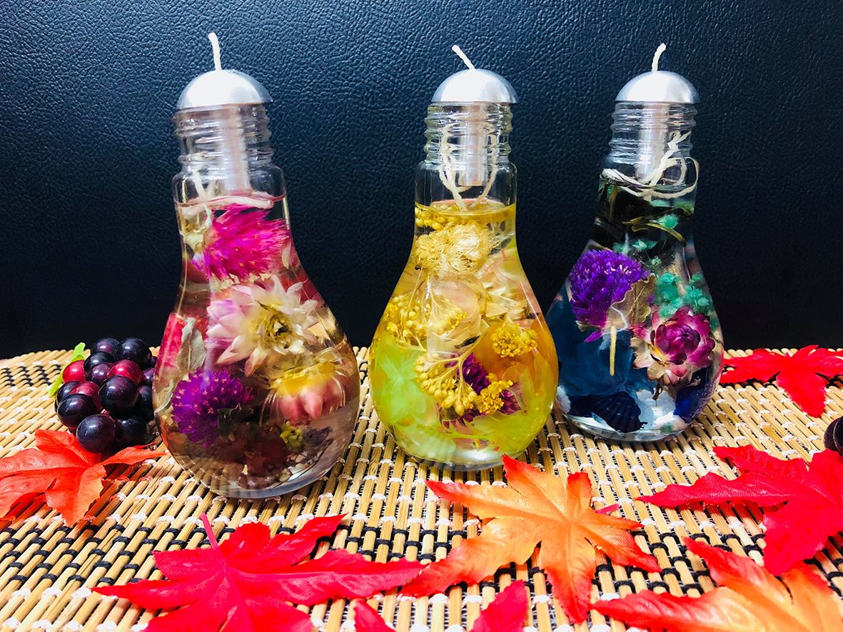 昼は植物の美しさを楽しむハーバリウム、夜はランプとして炎のゆらぎに癒される素敵なインテリアをお作りいただきます。