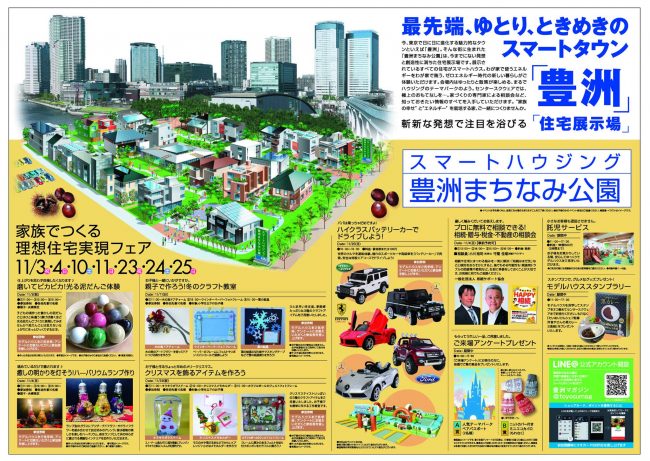 スマートハウジング豊洲まちなみ公園のハウジングフェアは、平成30年11月3日(祝)4日(日)10日(土)11日(日)23日(祝)24日(土)25日(日)の計7日間にわたって開催します!