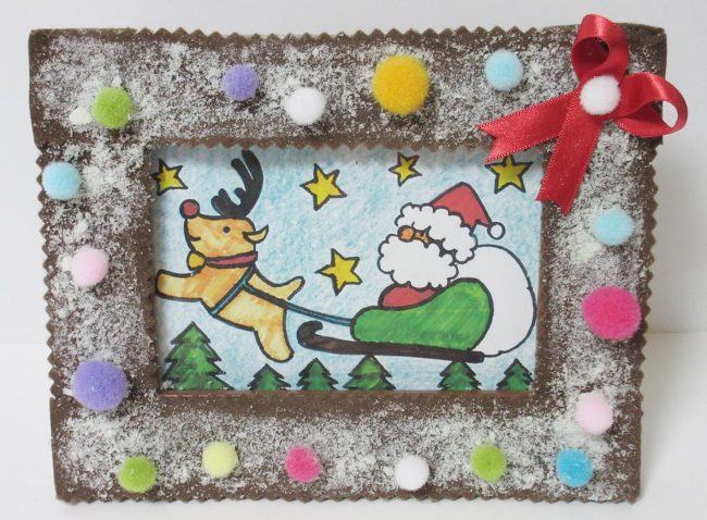 フレームに厚みのあるフェルトを貼り付けボンボンをカラフルに飾ろう♪