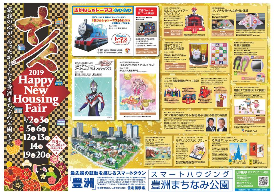 スマートハウジング豊洲まちなみ公園のハウジングフェアは、平成31年1月2日(水)、3日(木)、5日(土)、6日(日)、12日(土)、13日(日)14日(祝)、19日(土)、20日(日)の計9日間にわたって開催します!