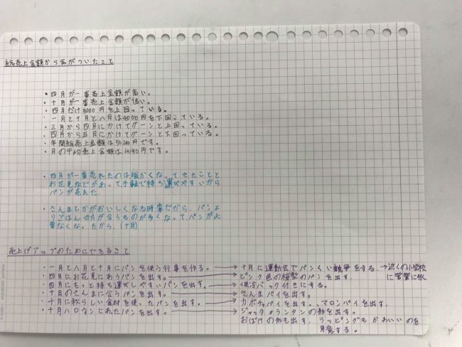 すると、一人の生徒が、家で自発的に、そのパン屋さんの売上の分析と今後、どうやったらもっと売れるかを考えてきてくれました!