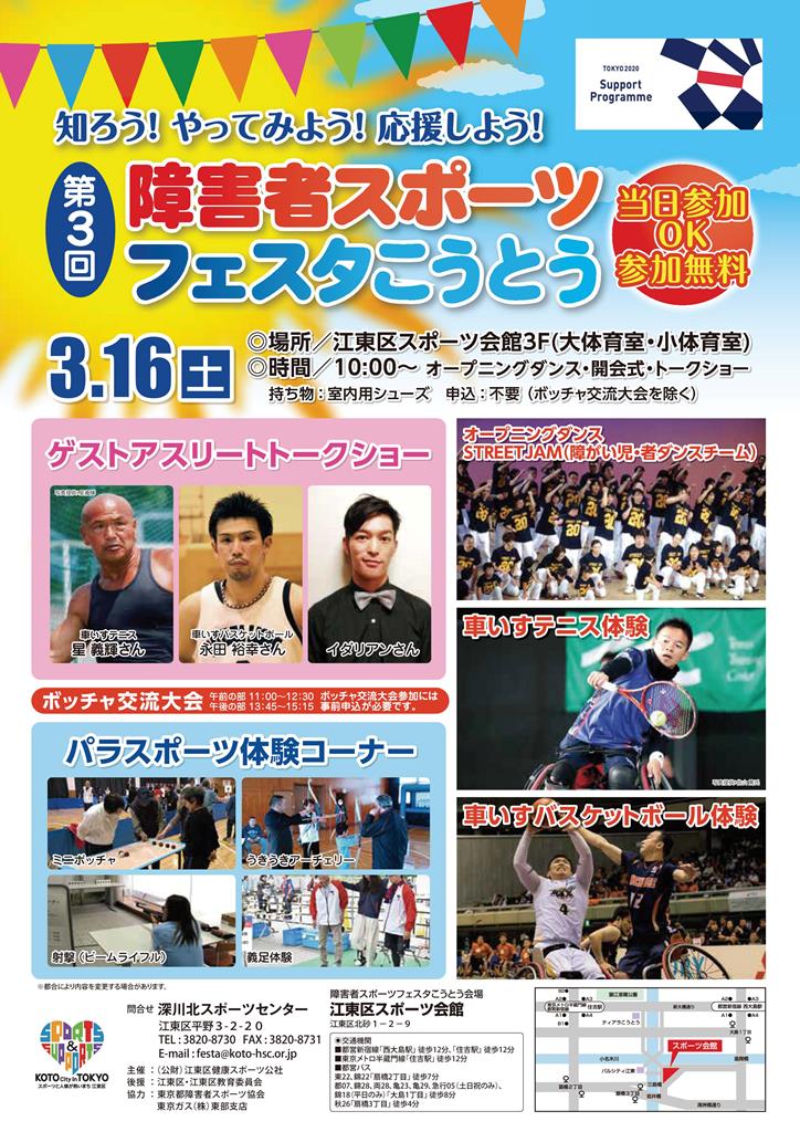 江東区スポーツ会館は3月16日(土)、「第3回 障害者スポーツフェスタこうとう」を開催します。