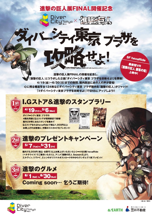 ダイバーシティ東京プラザは、6月30日(日)までの期間、『進撃の巨人』とコラボした企画「ダイバーシティ東京 プラザを攻略せよ!」を開催中です!