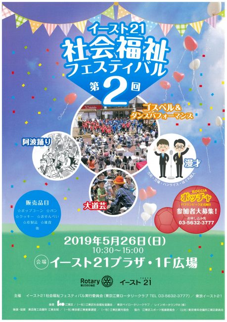 5月26日(日)、東陽町イースト21プラザ・1F広場にて「第2回社会福祉フェスティバル」が開催されます。
