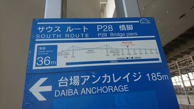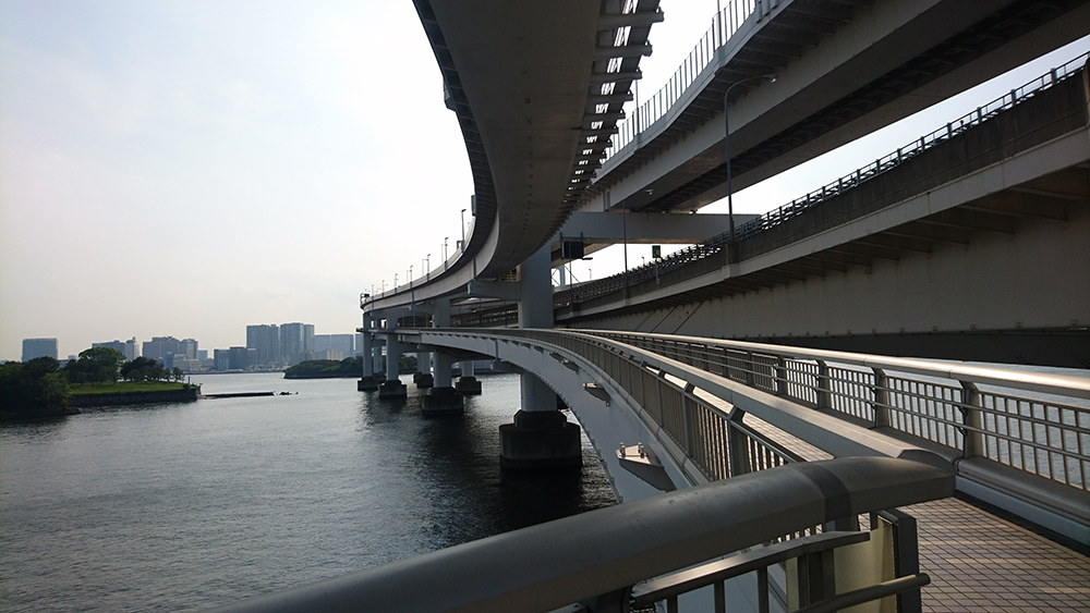 芝浦側の入り口の建物から外にでると、今まさに歩いて来たレインボーブリッジが真っ直ぐに伸びていました。