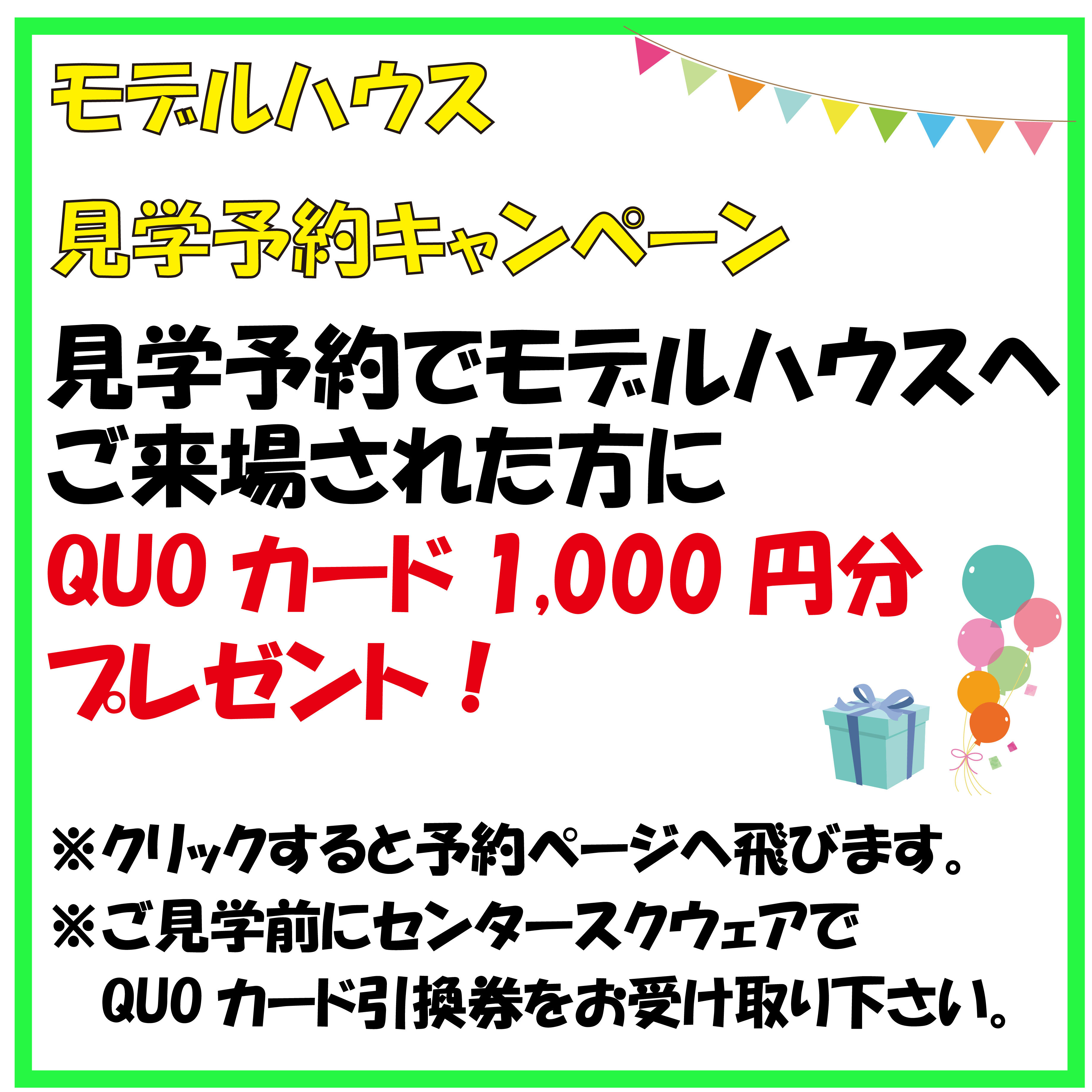 WEBサイトにてモデルハウスご見学予約をされた方にもれなく1000円分のQUOカードをプレゼントいたします♪