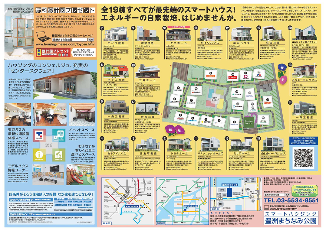 スマートハウジング 豊洲まちなみ公園 東京都江東区豊洲6-1-9 【お車でお越しの方】 首都高10号晴海線「豊洲」出口よりすぐ 首都高1号羽田線「銀座」出口より10分 無料駐車場 約100台 【電車でお越しの方】 東京メトロ有楽町線「豊洲駅」7番出口徒歩約8分 新交通ゆりかもめ「新豊洲駅」北口徒歩約3分 TEL:03-5534-8551 ※センタースクウェアは、豊洲まちなみ公園の中にあります。 アクセスマップ