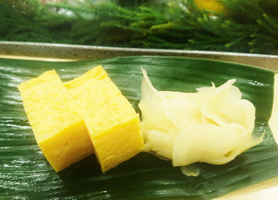 まずは笹の葉の器に卵焼きとガリが置かれました。
