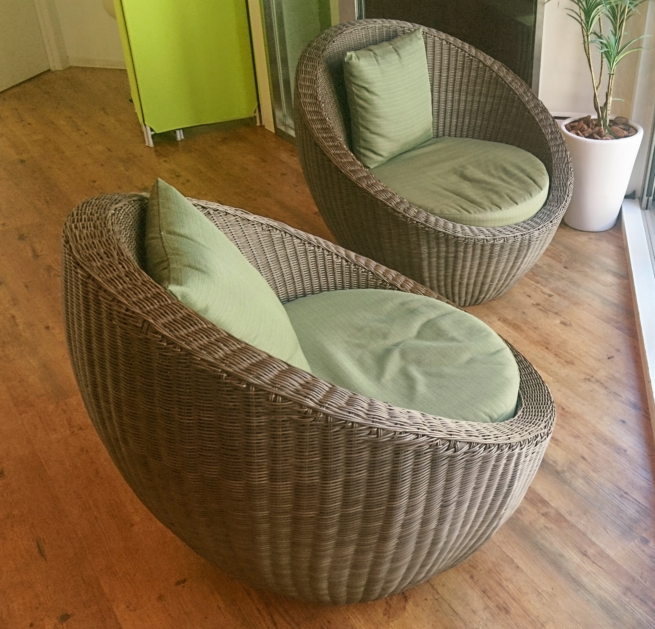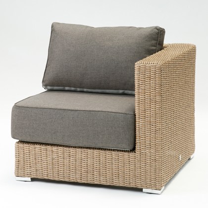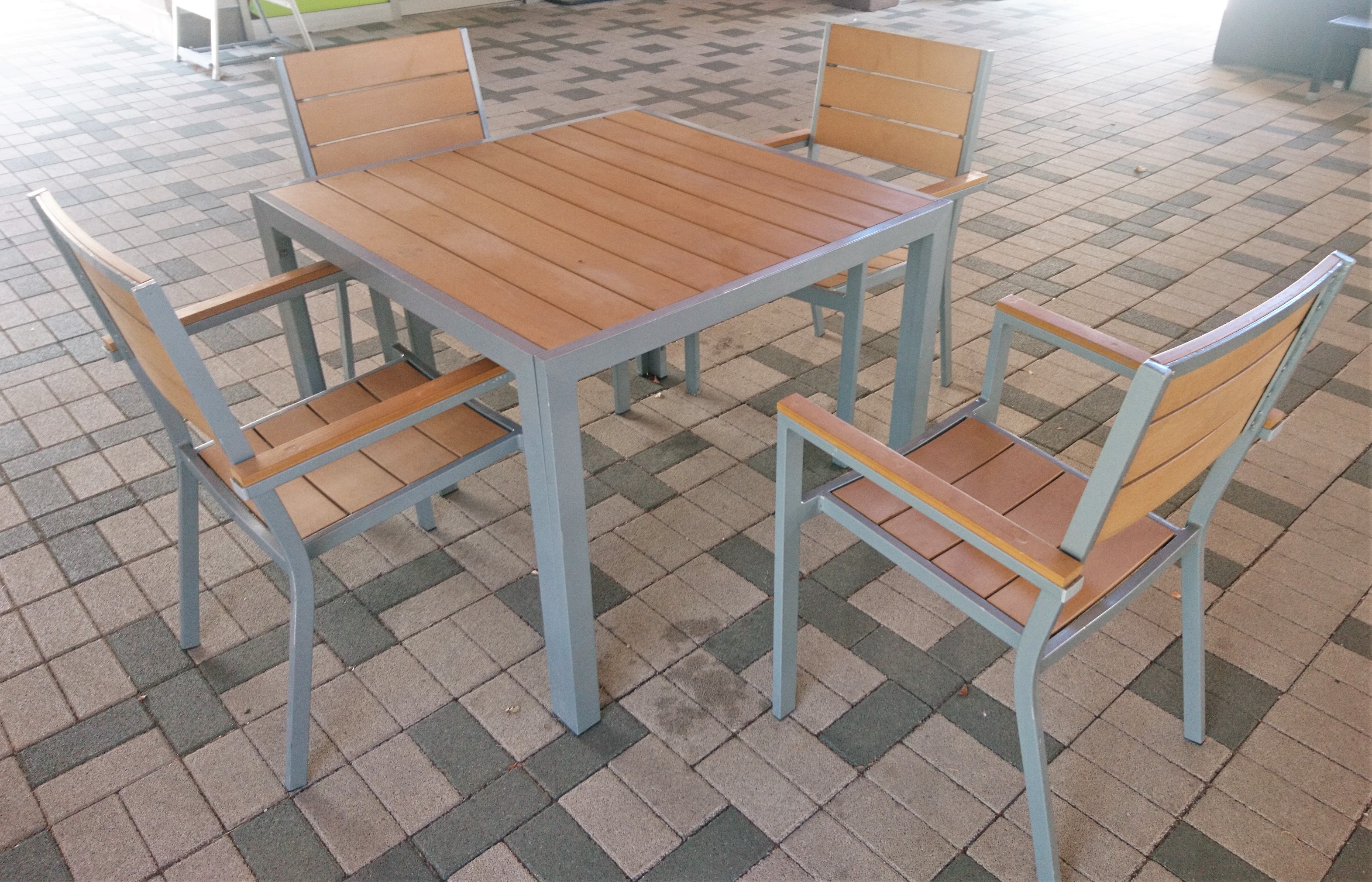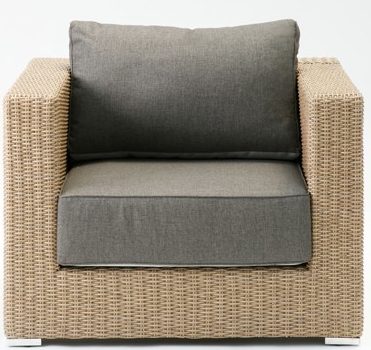 サンデンファニチャーはアウトドアでの使用を考え、主材にアルミとシンセティックラタンを使用しクッションファブリックにも撥水生地を使用しています。