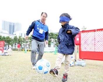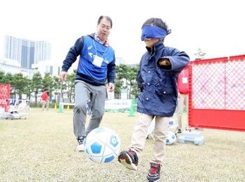 アイマスクを着用し、スタッフの声を頼りにゴールを狙う体験ができます。