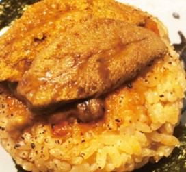 つぶ貝炊き込みご飯にウニを練り込み、ウニ醤油で香ばしく焼き