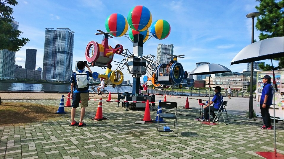 カラフルで可愛いヘリコプターに子供たちが元気いっぱいに乗り込み空中散歩♪