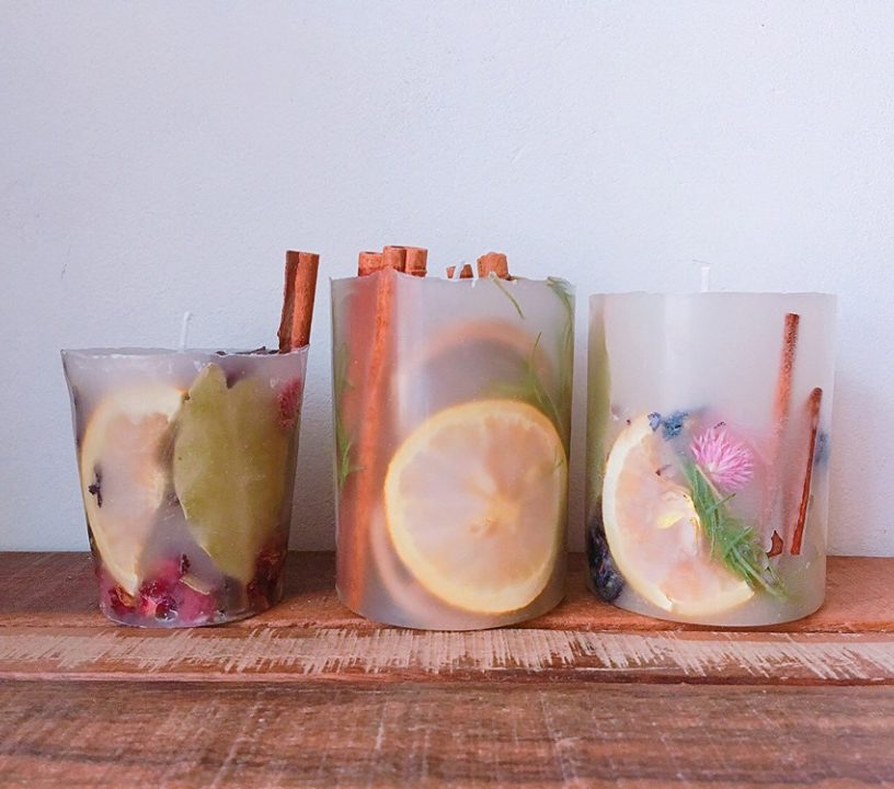 ドライフラワーやフルーツを組み合わせて、自分好みのキャンドルをお作りいただけます。キャンドルワックスにアロマを加えれば、見た目も、香りも楽しめる素敵なインテリアに✨