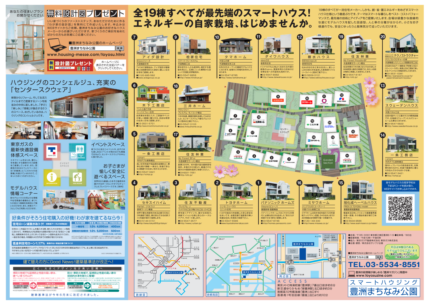 スマートハウジング 豊洲まちなみ公園 東京都江東区豊洲6-1-9 TEL:03-5534-8551 【お車でお越しの方】 首都高10号晴海線「豊洲」出口よりすぐ 首都高1号羽田線「銀座」出口より10分 無料駐車場 約100台 【電車でお越しの方】 東京メトロ有楽町線「豊洲駅」7番出口徒歩約8分 新交通ゆりかもめ「新豊洲駅」北口徒歩約3分 ※センタースクウェアは、豊洲まちなみ公園の中にあります。