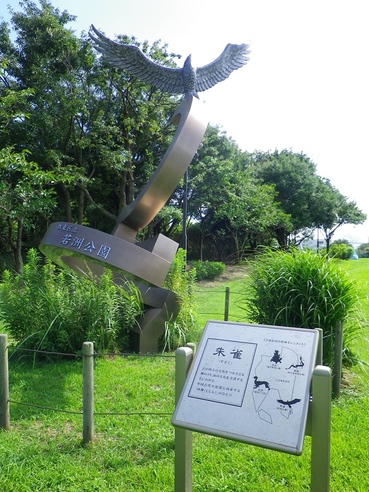 こちらの「朱雀」は若洲海浜公園が2006年4月に区へ移管され、区立若洲公園となり、移管を記念して多目的広場の北東の一角に設置されたそうです。