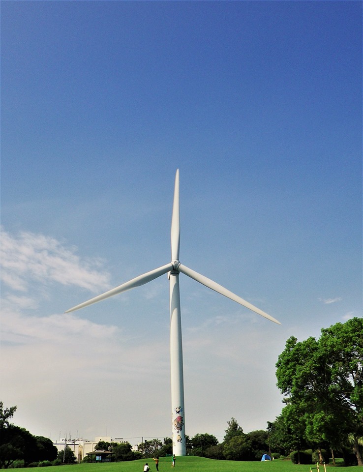 この大きな風車から風のエネルギーで電気が生み出される姿……