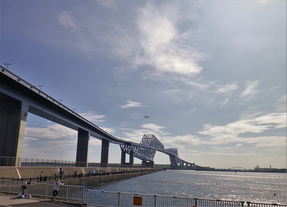 東京湾に浮かぶゲートブリッジの上を、飛行機が飛び交っています。