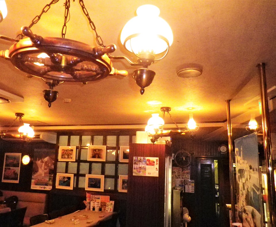店内は落ち着いた雰囲気で、天井には『舵輪(船のハンドル)』をモチーフにしたライトが並んでいます。レストラン部分はテーブル席がきちんと並んでいて40席。3階の和室60席+洋室40席と合計140席あるようです。