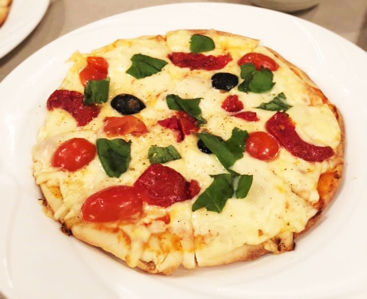 トマトとバジルの香りが食欲をそそります。薄焼きの生地で周りはサクッとした食感で何枚でも食べられそう!