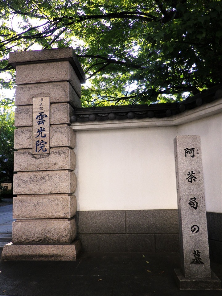 家康の死後に江戸に移り、竹橋に屋敷と300石の化粧料が与えられ、『雲光院』と号したが剃髪はせず、秀忠の没後に正式に剃髪したともされています。こちらの『雲光院」は阿茶局が開山されたそうです。83歳で亡くなられて、こちらに葬られたようですね。