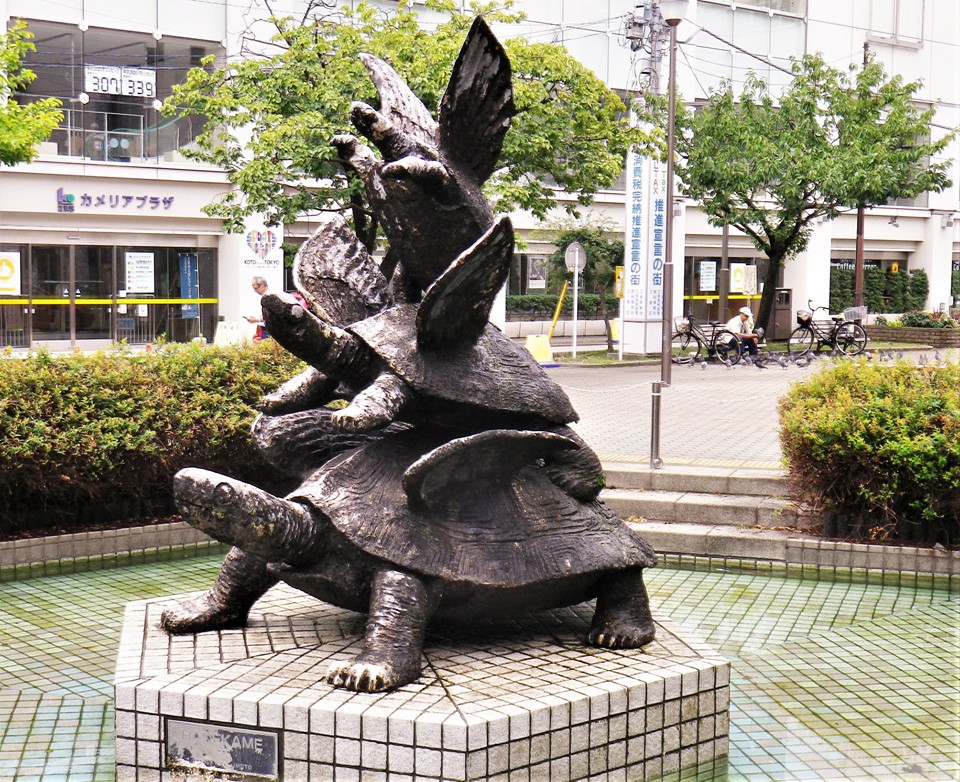 2004年に亀戸駅前公園を改修した時に、「はね亀」を北の「玄武」に見立てて設置したそうです。亀のモニュメント「HANEKAME’92」は造形作家の松本哲哉さんの作品だそうです。