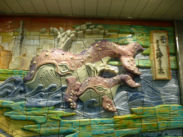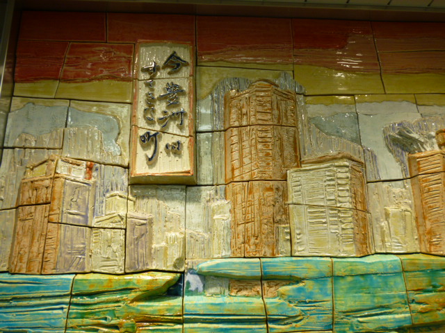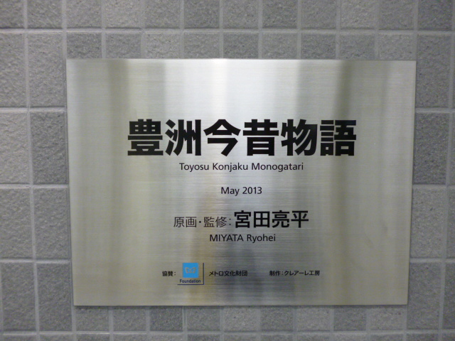 有楽町線豊洲駅の改良工事に伴い、“うるおい空間を演出するパブリックアートを”という制作依頼があり、現在豊洲在住の宮田さんは、海への想い、豊洲の現在・過去・未来に想いを馳せて“豊洲今昔物語”を制作したそうです。