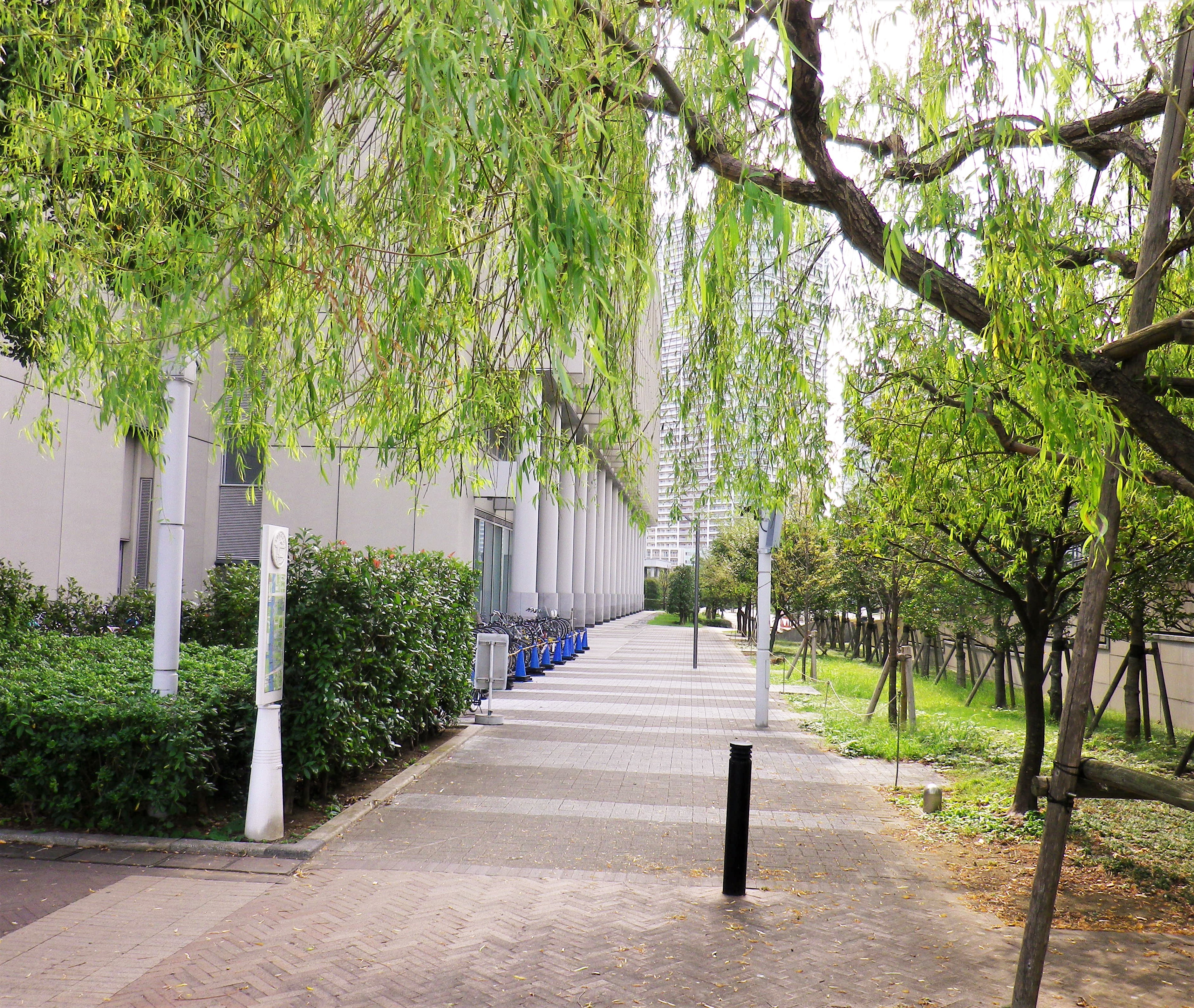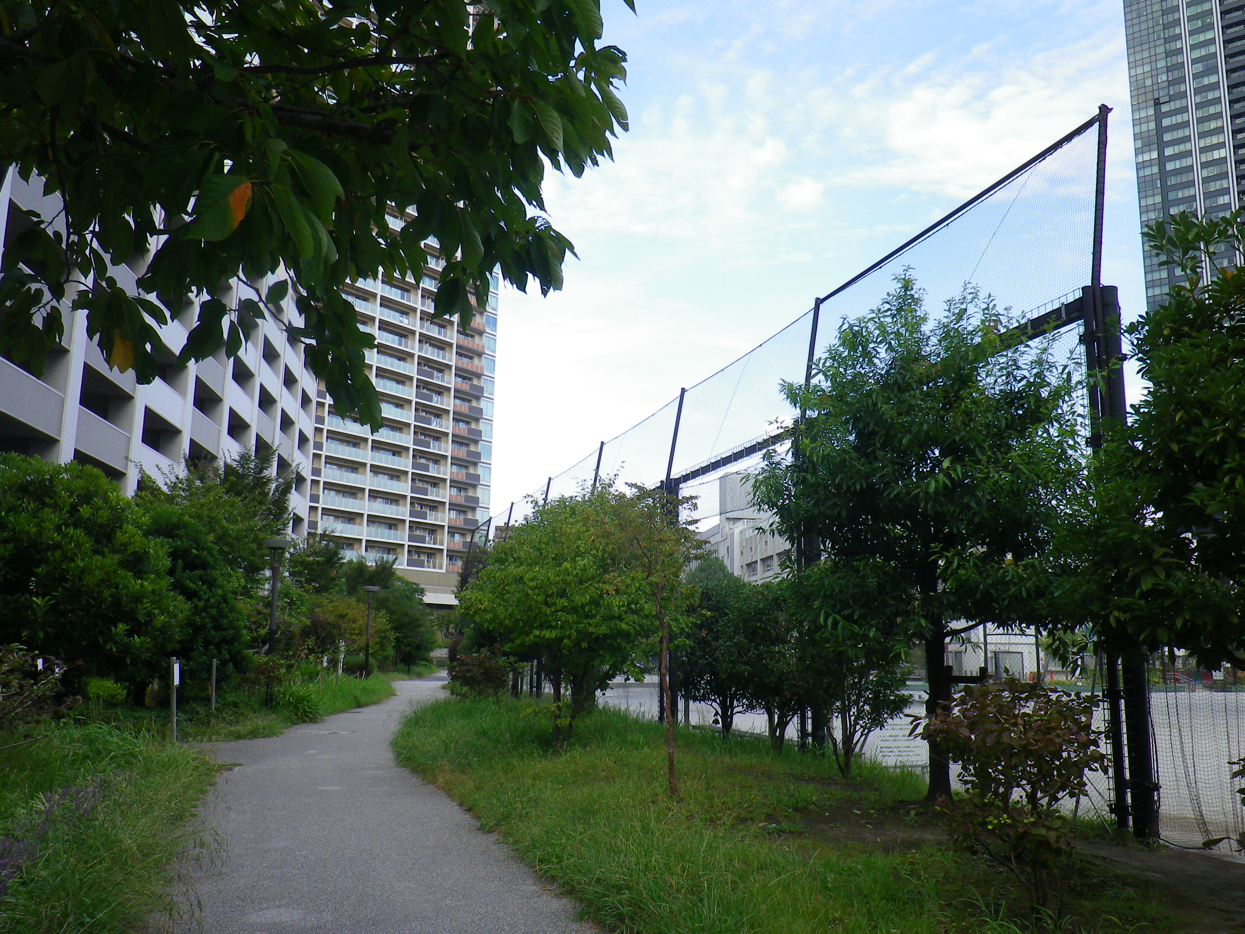 高層マンションの間に小径が伸びています。緑が涼しげですね。